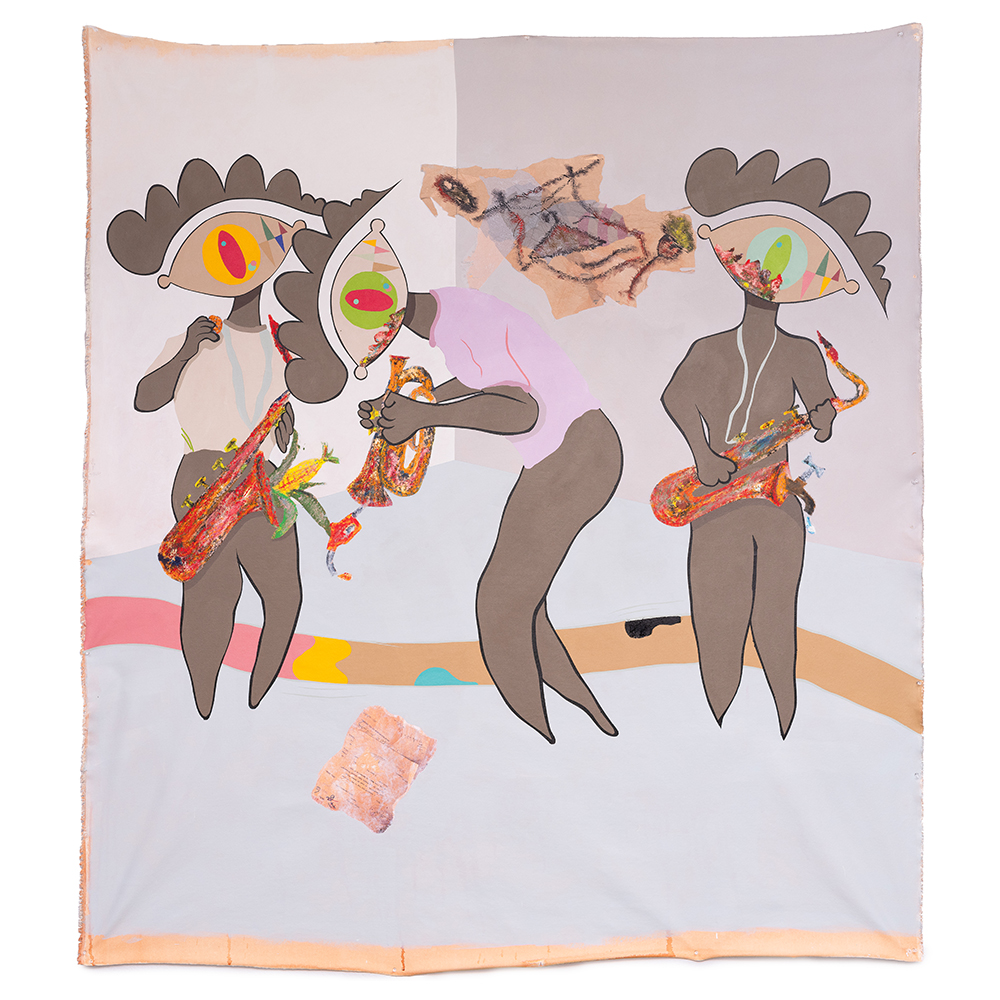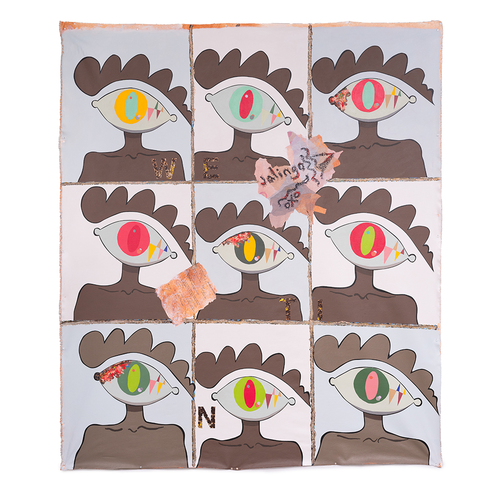 Acrylic, Oil Stick, Charcoal, Polythene and Transfer on unstretched canvas 80in x 72in 2024
