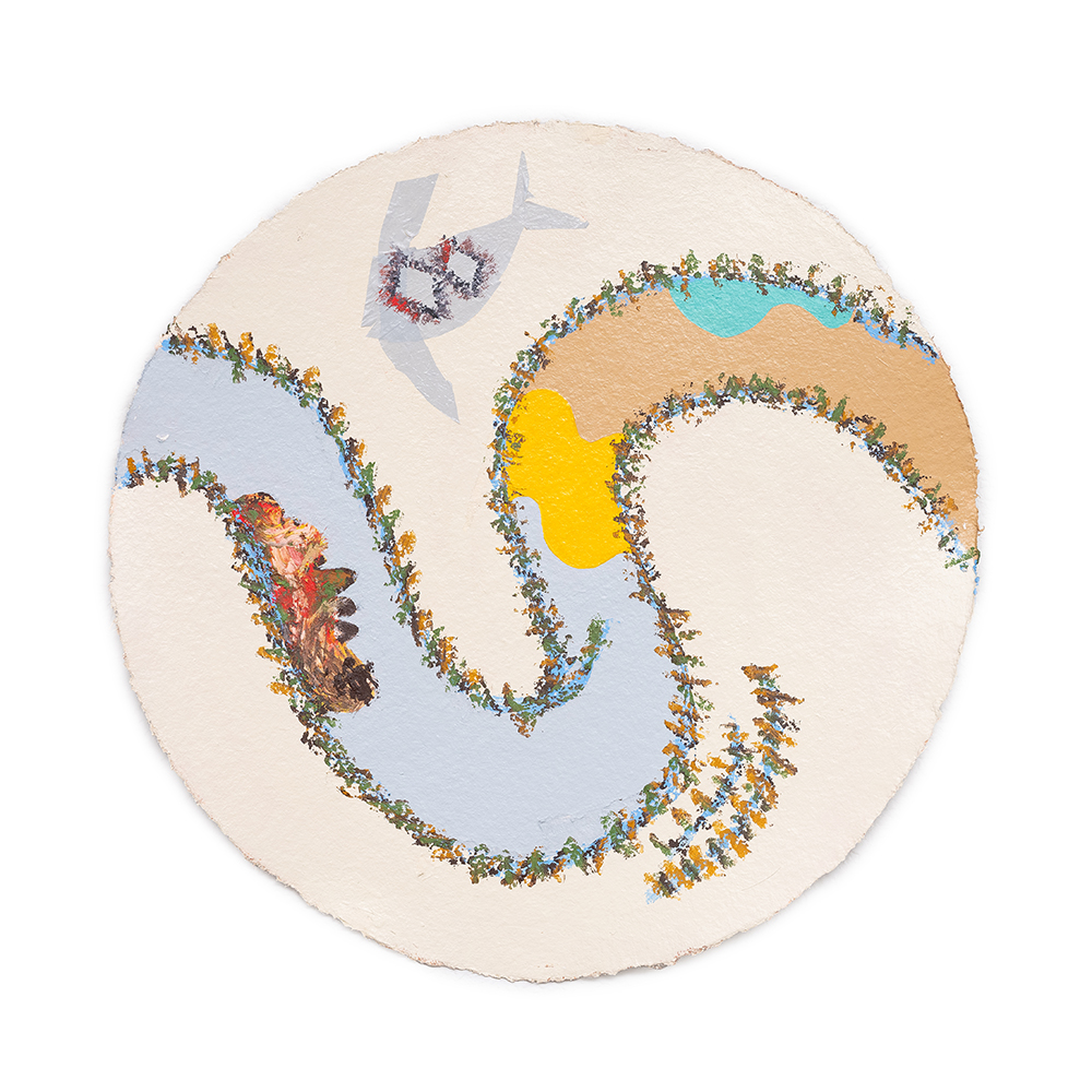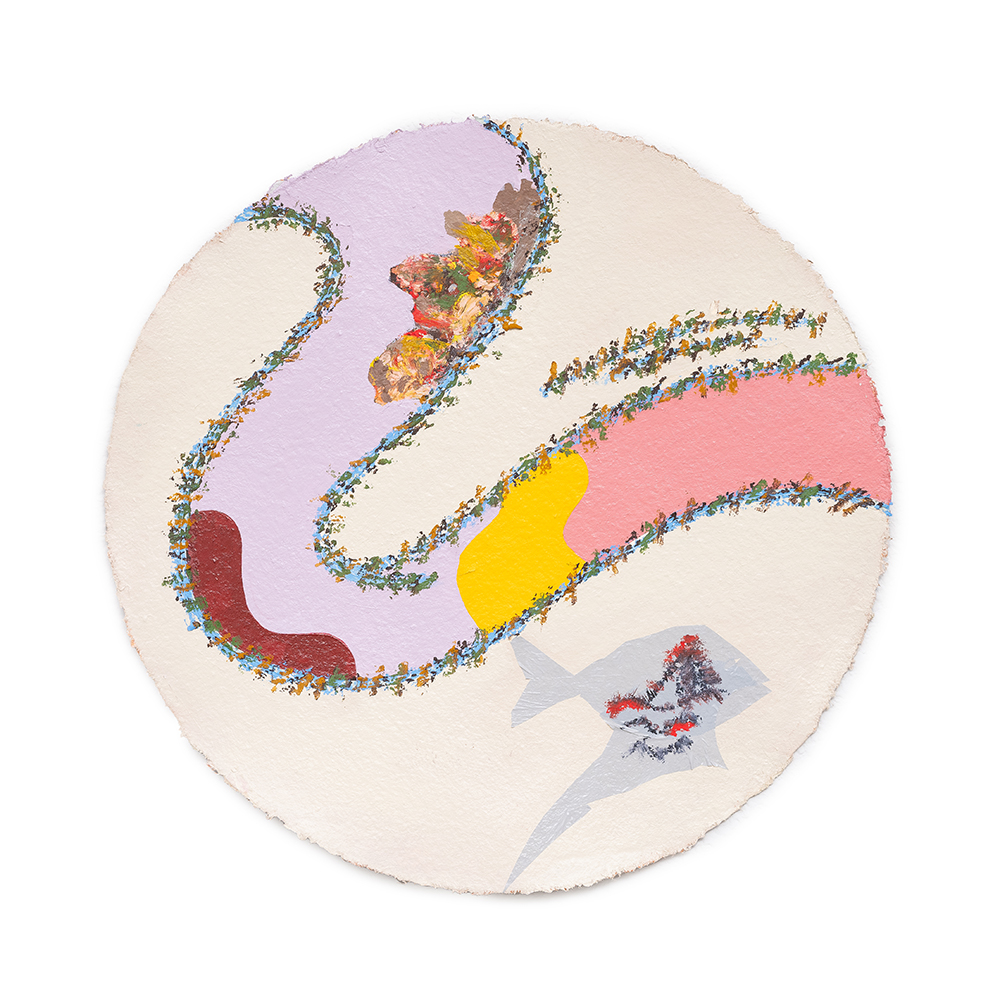 Acrylic, Oil Stick, and Polythene on paper 16in diameter 2024